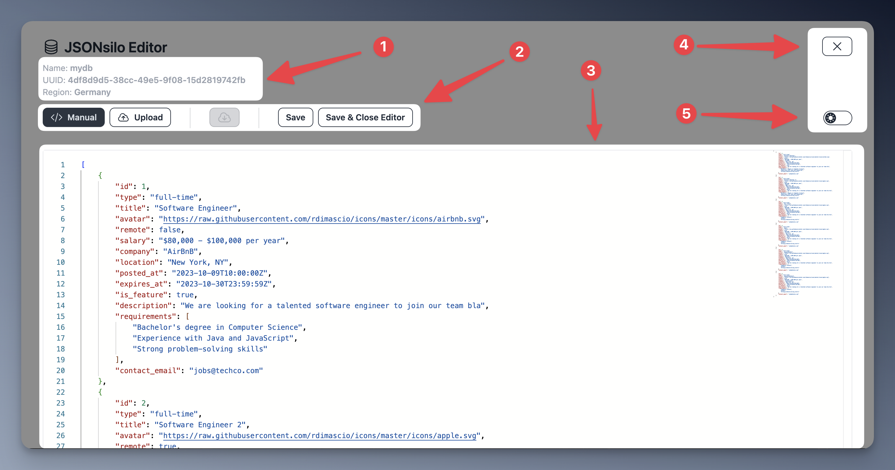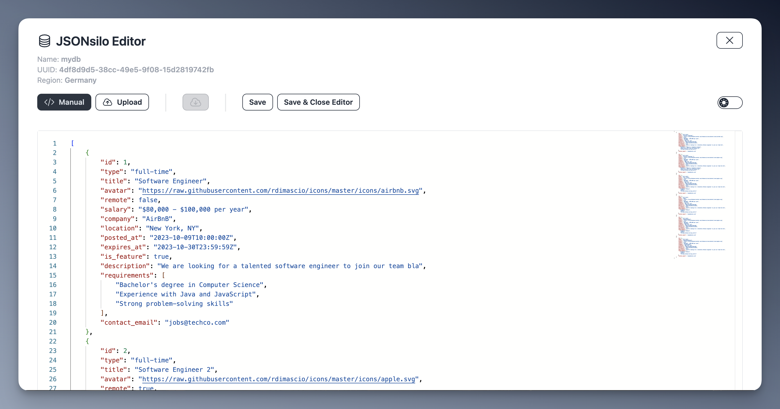 The JSONsilo editor is a crucial tool that allows you to manage JSON content more easily. It provides an intuitive interface for editing and updating your silo data.